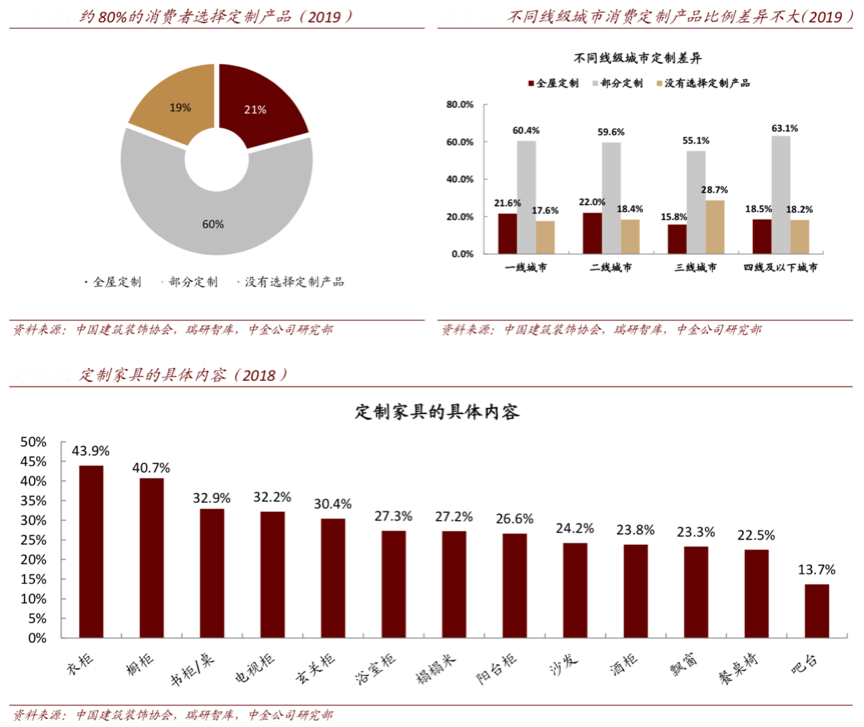 建材家居消費具有一整式、集合式特點,一站式購買、集合式安裝等受到企業的更多關注,“集合式消費”日益成為建材家居行業性消費趨勢。根據中國建筑裝飾協會、瑞研智庫、中金公司研究部等綜合資訊表明,約80%的家居消費者會選擇定制產品,三四線下沉市場人群對部分定制家居產品的接受度比較高,其家居消費能力正在逐步崛起。