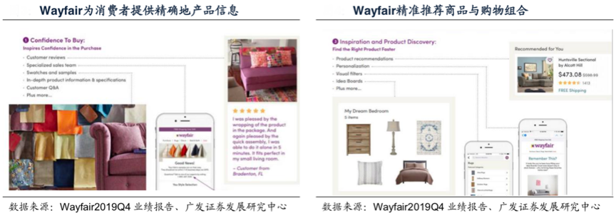 經(jīng)典案例:根據(jù)Wayfair2019Q4業(yè)績報告、廣發(fā)證券發(fā)展研究中心等綜合資訊表明,2015年以前,國際級家居品牌Wayfair針對消費(fèi)者“線上瀏覽,線下購買”的消費(fèi)習(xí)慣,推出“Get it near me”計劃,為用戶推薦意愿購買商品的附近商店,滿足其線下體驗的需求。在用戶體 驗方面,Wayfair為消費(fèi)者提供帶有精確尺寸、材質(zhì)的產(chǎn)品圖片和3D可視化家居布景, 幫助用戶建立線上消費(fèi)信任。