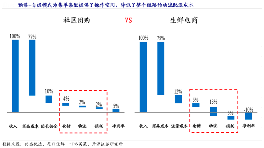 經(jīng)典案例:從興盛優(yōu)選、每日優(yōu)鮮、叮咚買菜、開源證券研究所等綜合資訊表明,相比于前置倉模式的終端配送成本每單在 7-8 元左右,社區(qū)團購模式下,從網(wǎng)格倉到提貨點的物流成本可以被壓縮到每單 1 元以內(nèi)。履約成本的大幅降低,也極大增加了商品銷售可觸達的范圍。