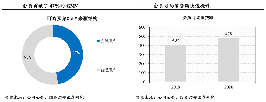 經典案例:根據公司公告、國泰君安證券研究等綜合資訊表明,叮咚買菜會員 GMV 消費金額不斷提高,其會員對平臺的認可度不斷提高,根據招股書顯示,2021Q1 平均每月交易用戶 690 萬,其中會員占比為 22%(約 152 萬),會員平均每用戶月均單量 6.7 次,GMV 貢獻比 例為 47%。會員的月消費金額由 2019 年的 407 元增長到2020 年的 478 元,呈上升趨勢。