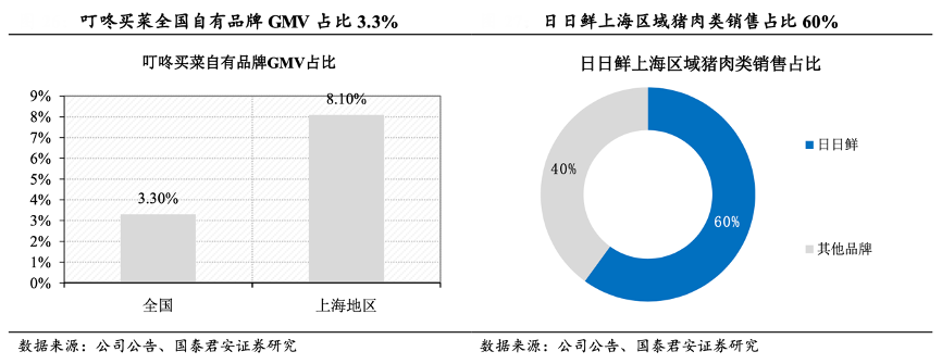 經典案例:根據公司公告、國泰君安證券研究等綜合資訊表明,2021Q1,叮咚買菜公司自有品牌的產品GMV占比為 3.3%,在上海地區自有品牌占比為8.1%。公司 2020 年 7 月推出自有品牌 Daily Fresh Pork 日日鮮豬肉,2021Q1日日鮮豬肉在上海地區占豬肉類銷售額的40%以上。