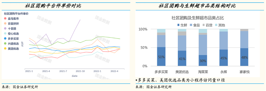 經典案例:根據國金證券研究所等綜合資訊表明,2020年8月拼多多公司推出多多買菜業務,截至目前多多買菜市場份額達到42%,龍頭優勢明顯。公司傳統優勢品類-生鮮農產品(果蔬肉蛋)是主要的銷售來源。從多多買菜小程序的品類訪問結構來看,蔬菜/水果/肉蛋占比近一半,生鮮平均單價低于標品及百貨,預計低毛利的生鮮品類占比低于50%。