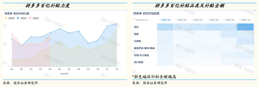 經典案例:根據國金證券研究所等綜合資訊表明,2019年6月,拼多多公司推出百億補貼計劃,聯合品牌商家補貼上萬款商品。補貼力度:2021年相比2020年補貼力度持續提升,2022 年 3 月至 5 月期間主要受疫情影響,可選品類的消費需求走弱,商家補貼意愿和營銷投放意愿降低。補貼品類方面,手機、家電、化妝品、服飾等為補貼的重點品類。