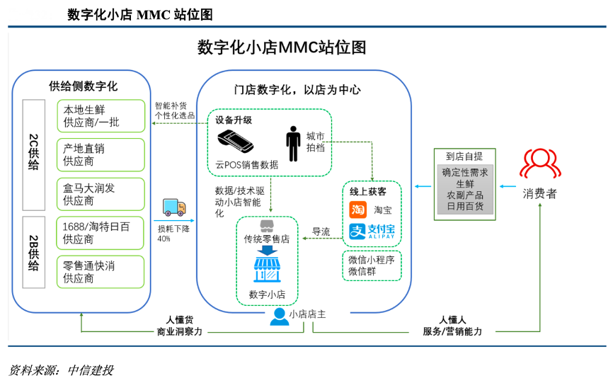 經(jīng)典案例:根據(jù)中信建投等綜合資訊表明,相比于美團(tuán)的線下地推以及多多買菜的社交裂變,阿里依托零售通背后下沉市場的 100 多萬實體門店資源,一方面將門店數(shù)字化,通過淘寶、支付寶完成線上獲客,另一方面其在選品和供應(yīng)鏈上更加面向下沉市場,固定經(jīng)營場所增加服務(wù)確定性,穩(wěn)定的鄰里關(guān)系提供個性化分層服務(wù),數(shù)字感知設(shè)備入場能讓小店聚攏規(guī)模化需求,反哺生產(chǎn)端,有利于建立基于下沉市場小店模式的社區(qū)團(tuán)購。
