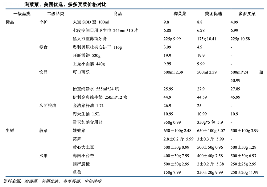 經(jīng)典案例:根據(jù)淘菜菜、美團(tuán)優(yōu)選、多多買菜和中信建投等綜合資訊表明,在性價比基礎(chǔ)上,淘菜菜強(qiáng)調(diào)好品質(zhì)和豐富性,希望為下沉市場帶來一日三餐的消費升級,而不是與線下消費場景進(jìn)行簡單的價格競爭。