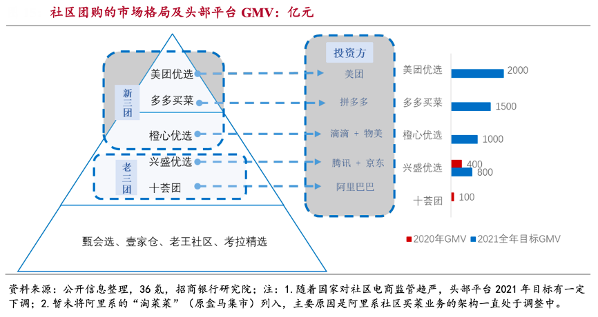 經典案例:根據公開信息整理、36氪、招商銀行研究院等綜合資訊表明,目前社區團購第一、第二梯隊主要包括背靠互聯網小巨頭流量支持的“新三團”美團優選(美團)、多多買菜(拼多多)、橙心優選(滴滴)和從社區團購混戰中幸存的“老三團”成員興盛優選、十薈團1,其他社區團購平臺還包括甄會選、壹家倉等小型平臺。