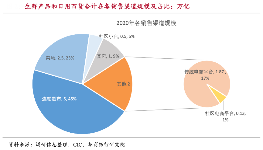 經典案例:根據調研信息、CIC、招商銀行研究院等綜合資訊表明,生鮮電商以銷售生鮮產品和日用百貨為主線上銷售平臺,其中生鮮作為通路商品實現引流,輔以高毛利日用百貨作為其盈利來源。根據 CIC 數據,2020年我國整體生鮮+日用百貨的合計市場規模約為 11 萬億(生鮮 5 萬億、日百 6 萬億),對應電商銷售規模約 2 萬億,滲透率約 19%。與之品類相似的線下渠道主要包括連鎖商超、菜場、社區小店等,對應市場規模分別約 5、2.5、0.5萬億。