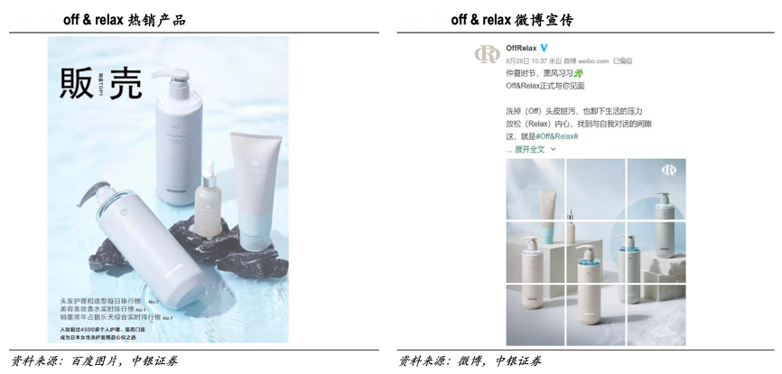 經典案例:根據百度圖片、微博、中銀證券等綜合資訊表明,2021年 6 月 28 日公司通過溫泉水頭皮護理品牌off&relax 布局內地高端洗護類產品。off&relax為頂級研發工程師楊建中與珀萊雅合作共創:楊建中深耕頭皮洗護領域 26 年,在全球擁有 50 多項專利,主要負責產品的產線,而珀萊雅負責中國市場的運營,截至目前已有 7 款SKU。