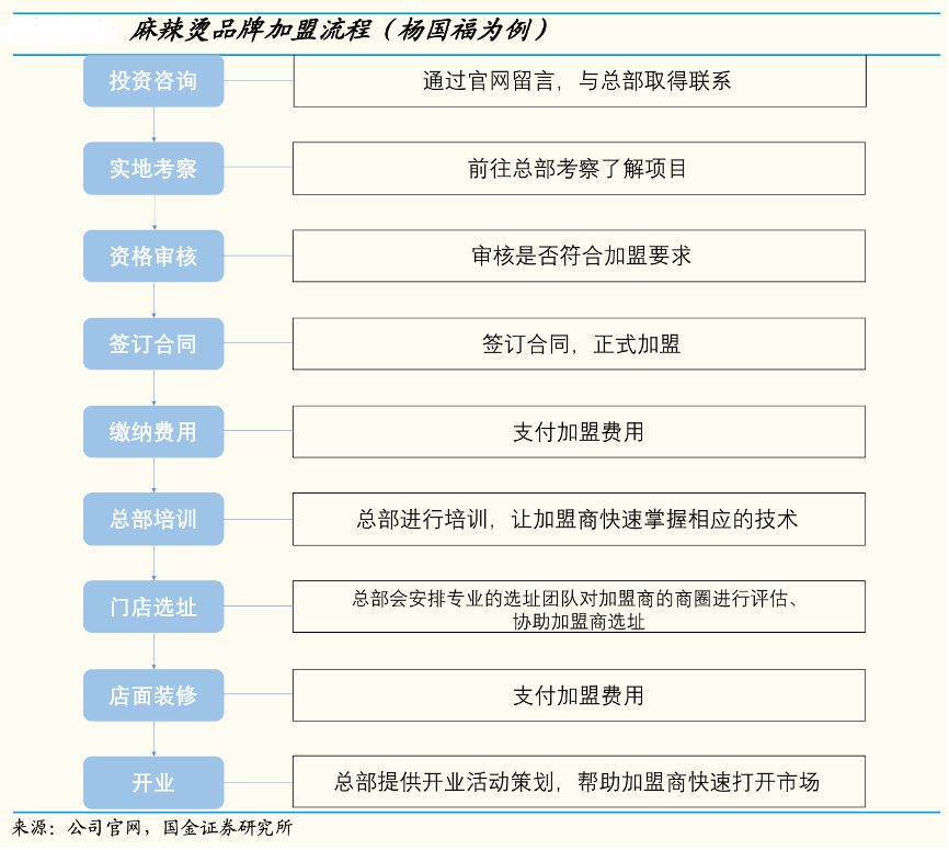 經典案例:根據公司官網、國金證券研究所等綜合資訊表明,行業(yè)龍頭品牌主要采用“供應鏈-加盟商-消費者(S2B2C)”模式進行快速拓店,代表如楊國福、 張亮。其加盟商能夠發(fā)揮當地選址、攬客、用工等優(yōu)勢,且自負盈虧使得其經營過程中更具主觀能動性。根據楊國福招股說明書和張亮麻辣燙官網披露數據,楊國福截至 3Q21 末的 5783 家餐廳中僅 3 家直營店、其余均為加盟店,張亮麻辣燙目前 5000+門店中直營僅 100+。