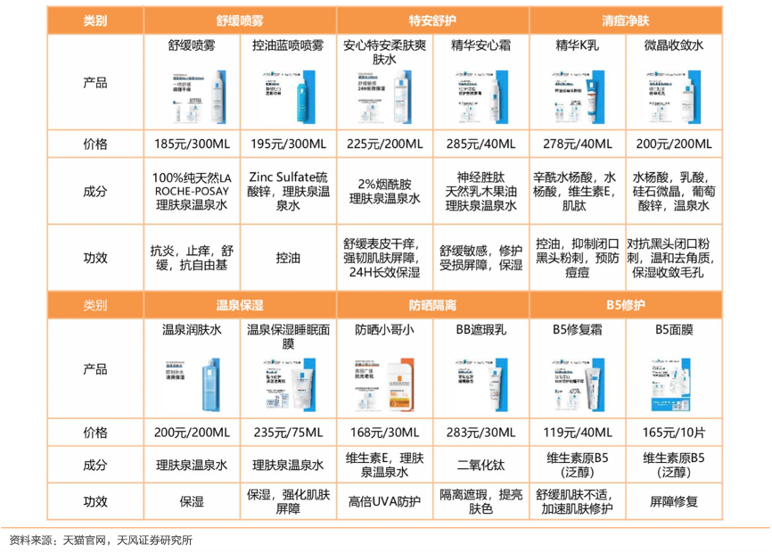 經典案例:根據天貓官網、天風證券研究所等綜合資訊表明,理膚泉產品成分安全有效、嚴格遵循 GMP 標準生產、共有六大系列。理膚泉產品分為以 下六個系列:1)舒緩噴霧:補水、保濕、舒緩噴霧;2)特安舒護:保濕、舒緩肌膚、修 護;3)清痘凈膚:修護、滋養、舒緩修護;4)溫泉保濕:補水、保濕、水潤清透;5) 防曬隔離:補水、防曬、隔離、清爽;6)營潤身體:保濕、滋潤、修護、滋養肌膚。產品生產嚴格遵循 GMP 標準,包裝無菌安全。
