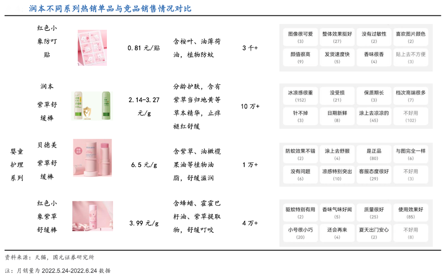 經典案例:根據天貓、國元證券研究所等綜合資訊表明,相比于國內外同類產品,潤本依托明星單品人氣,并利用自身長期積累的品牌“勢能”,其圍繞相關細分方向推出如精油貼、驅蚊手環、舒緩紫草膏,嬰兒液體爽身粉等產品, 以滿足需求日趨精細化的消費者并逐步抬升自身發展天花板。