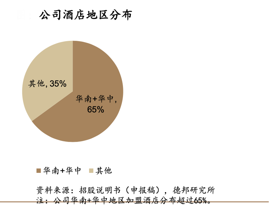 經典案例:根據招股說明書(申報稿)、德邦研究所等綜合資訊表明,東呈酒店始終持續深耕華南、華中地區,兩個地區加盟酒店分布超過65%,同時收入占比2021年分別達到42.98%、27.64%。其在持續深耕華南區域和華中區域基礎上,不斷向華東、西南、華北等地區拓展,形成以華中華南為根基、全國市場發展的局面。