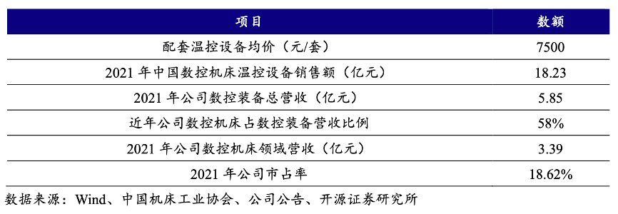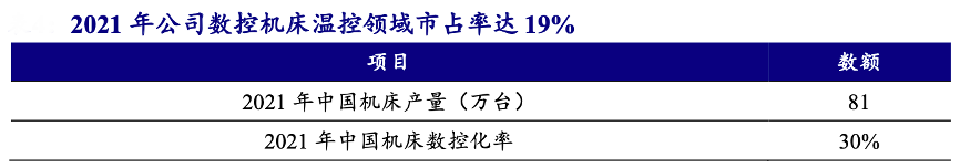 經典案例:根據wind、中國機床工業協會、公司公告、開源證券研究所等綜合資訊表明,同飛股份公司于 2009 年開始進入數控裝備溫控行業,過去20年成功實現國產替代,市占率為國內第一。其中公司2021年數控裝備總營收5.85 億元,其中近年來自數控機床營收占比約為58%。