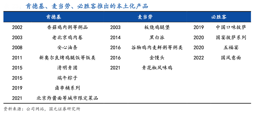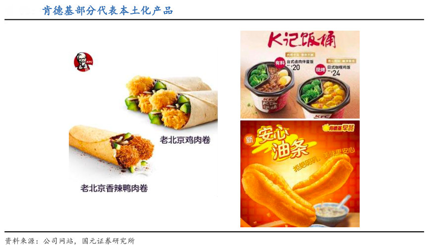 經典案例:根據公司網站、國元證券研究所等綜合資訊表明,肯德基在保留品牌核心產品的基礎上,通過調研掌握國人飲食文化與飲食習慣,創新研發出市場覆蓋率更高,和國人傳統飲食風格接近的新品種。如 2000 年 邀請國內食品營養專家成立食品健康委員會,每年推出 30-40 款新品,其中一半以上是具有中餐特色的產品。例如先后在北京地區推出類似北京烤鴨的“老北京雞肉卷”,在上海地區推出“枸杞南瓜粥”等粥類,在全國推出“安心油條”、豆漿、K記飯桶等產品。