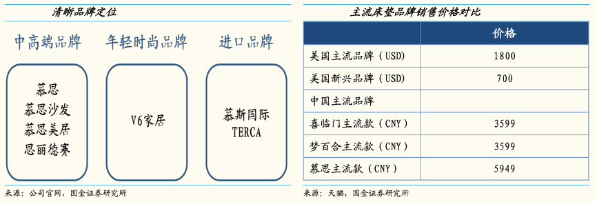 經(jīng)典案例:根據(jù)公司官網(wǎng)、天貓、國(guó)金證券研究所等綜合資訊表明,慕思公司主品牌慕思整體定位中高端,依托子品牌搶占其余細(xì)分市場(chǎng)。大眾市場(chǎng)方面,公司依托 V6 品牌進(jìn)行布局,而高端市場(chǎng)分別用 TERCA、思麗德賽等進(jìn)口 品牌進(jìn)行布局。