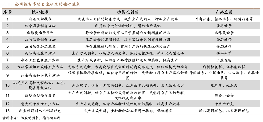 經(jīng)典案例:根據(jù)招股說明書、德邦研究所等綜合資訊表明,千味央廚公司于行業(yè)較早建立了“模擬餐廳后廚”研發(fā)實(shí)驗(yàn)室,通過模擬餐廳后廚的工藝,進(jìn)行產(chǎn)品研發(fā)及制作,以確保下游客戶在使用千味提供的產(chǎn)品時(shí)能最大程度發(fā)揮出其應(yīng)有的口感,為食客提供最佳的就餐體驗(yàn)。截至 2022 年 1 月,其共有 60 項(xiàng)專利,其中發(fā)明專利 1 項(xiàng),實(shí)用新型專利 8 項(xiàng),外觀設(shè)計(jì)專利 51 項(xiàng)。
