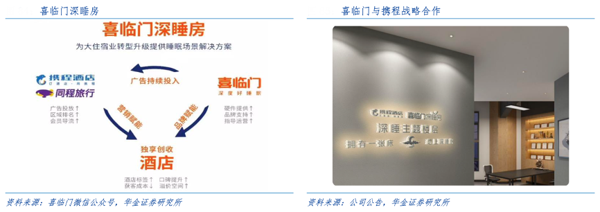 經典案例:根據喜臨門微信公眾號、公司公告、華金證券研究所等綜合資訊表明,喜臨門作為中國知名的寢具供應商,喜臨門相繼進駐人民大會堂、釣魚臺國賓館、國家大劇院等國字號單位,與希爾頓、萬豪、雷迪、喜來登等 500 余星級酒店品牌建立合作伙伴關系。2021年7月公司聯動攜程、同程OTA平臺啟動“喜臨門深睡房”項目,賦能現有酒店升級改造,升級用戶住店睡眠體驗。