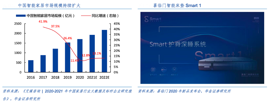 經典案例:根據艾媒咨詢、喜臨門2020年新品發布會、華金證券研究所等綜合資訊表明,2020年,喜臨門公司歷經 9 年研發,推 出 Smart 1 智能床墊,官網定價 36999 元,其擁有 768 個空氣彈簧、睡姿智能適應和匯聚 2.6 萬人的 AI 睡眠數據三大核心技術。Smart1 還在 C 端與華為智能生活平臺對接,B 端與涂鴉智能和華住合作, 將共同孵化智能睡眠市場。