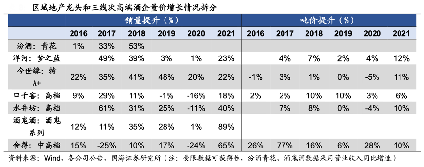 經(jīng)典案例:根據(jù)wind、各公司公告、國海證券研究所等綜合資訊表明,2016年,劍南春、水井坊等整體定位300-500 元價位的品牌業(yè)績彈性開始顯現(xiàn),區(qū)域次高端龍頭由于收入占比較小,對整體業(yè)績彈性貢獻較小,所以暫時沒有引起市場關(guān)注。2017年,三線次高端逐步開啟招商鋪貨全國化進程;下半年開始區(qū)域地產(chǎn)龍頭次高端價位開始自主放量。2018年酒企開始主動培育次高端產(chǎn)品后,三線次高端和區(qū)域龍頭的次高端產(chǎn)品銷量均有較快增長。