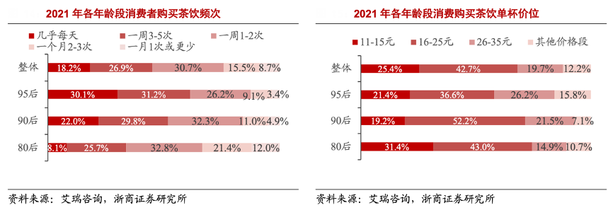 經典案例:根據艾瑞咨詢、浙商證券研究所等綜合資訊表明,從2021年各年齡段消費者購買茶飲頻次分布數據來看,年輕群體消費茶飲的頻次更高,以 95 后為 例,30.1%的 95 后消費者幾乎每天購買茶飲,31.2%的 95 后一周購買茶飲 3-5 次。另外,從茶飲單杯價位來看,95后選購 26-35 元價格帶的比例最高,達到26.2%。