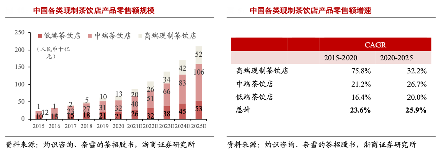 經典案例:根據灼識咨詢、奈雪的茶招股書、浙商證券研究所等綜合資訊表明,從零售額占比來看,2020 年中國高端現制茶飲零售額占中國整體現制茶飲的 19.7%,截至 2020 年 12 月 31 日,中國約有 34.8 萬間現制茶飲店,其中高端現制茶飲店約 3400 家,中端約 14.15 萬家,低端約 20.35 萬家,高端門店數量占比約1%,結合零售額占比,高端茶飲店平均店效遙遙領先。