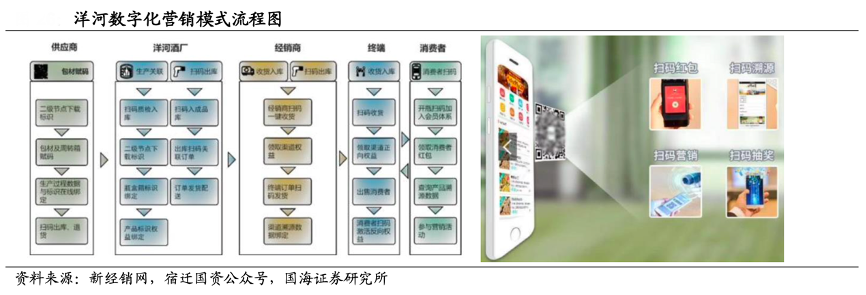 經典案例:根據新經銷網、宿遷國資公眾號、國海證券研究所等綜合資訊表明,洋河“數字化營銷模式”通過數字化掃碼掌握消費者實際開瓶數據、及渠道(經銷 商、煙酒店)進出庫數據,獲知需求端及渠道端數據,已實現掌握消費者實際 需求情況以匹配供給端發貨,形成市場供求關系長期緊平衡的目的,并進一步保障了控盤分利制度的落地,維持經銷商積極性。