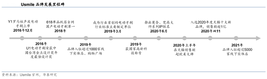 經(jīng)典案例:根據(jù)Usmile官網(wǎng)、華泰研究等綜合資訊表明,Usmile是廣州星際悅動(dòng)股份有限公司旗下全面口腔護(hù)理品牌,倡導(dǎo)像護(hù)膚一樣護(hù)理口腔。 2016 年至今共榮獲了 16 項(xiàng)國內(nèi)外設(shè)計(jì)大獎(jiǎng),2020 年“雙十一”期間,入選2020 年度天 貓十大新品牌,銷售額超 1 億,成為國內(nèi)首個(gè)破億的電動(dòng)牙刷品牌,在口腔護(hù)理新銳品牌銷售榜單中位居第一。2021年中消協(xié)發(fā)起的測(cè)評(píng)中,Usmile 電動(dòng)牙刷綜合實(shí)力位列第一,測(cè)試維度包括清潔效果、噪聲評(píng)價(jià)、充電放電時(shí)間等。