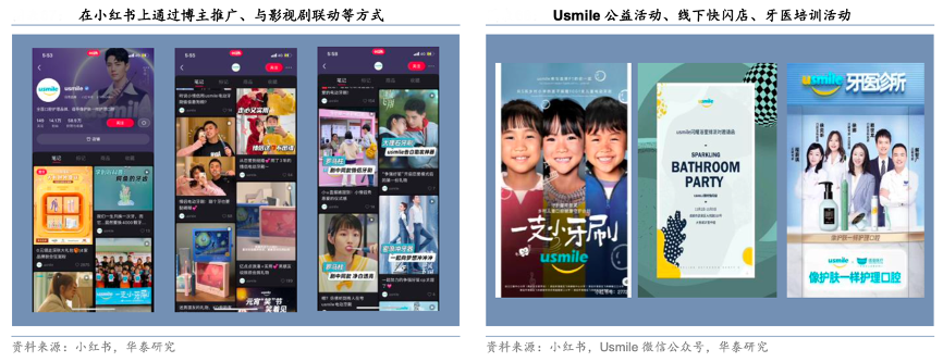 經(jīng)典案例:根據(jù)小紅書、Usmile微信公眾號(hào)、華泰研究等綜合資訊表明,2017 年,Usmile 看中了正處于上升期的小紅書,彼時(shí)其 Y1 系列新品剛上市,Y1 延續(xù) U1 的馬卡龍配色,外觀更加清新少女,在以女性為主要用戶群的小紅書,Y1 系列迅速走紅,至今銷量突破 405 萬,目前仍然是 Usmile 最受歡迎的產(chǎn)品。同時(shí)截至 21 年 5 月,Usmile 品牌入駐超 5000 家線下門店,其中包括屈臣氏、 伊藤洋華堂、銀泰西選、三亞免稅等中高端渠道,其中美妝店超 4500 家,這也符合品牌聚焦年輕女性消費(fèi)者的定位。