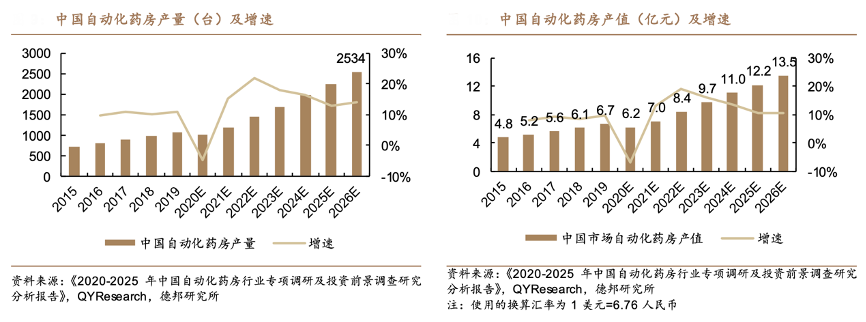 經典案例:根據《2020-2025年中國自動化藥房行業專項調研及投資前景調查研究分析報告》、QYResearch、德邦研究所等綜合資訊表明,中國藥房自動化正處于快速發展階段,市場空間巨大。根據 QYResearch 數據顯示,中國自動化藥房產量從 2015 年的 721 臺增長到 2019 年的 1,074 臺, CAGR 為 10.5%,產值從 2015 年的 4.8 億元增長到 2019 年的 6.7 億元,CAGR 為 8.8%;未來隨著醫療新基建的落地與政策的大力支持,預計 2026 年中國自動 化藥房產量預計將達到 2,534 臺,產值預計達 13.5 億元。
