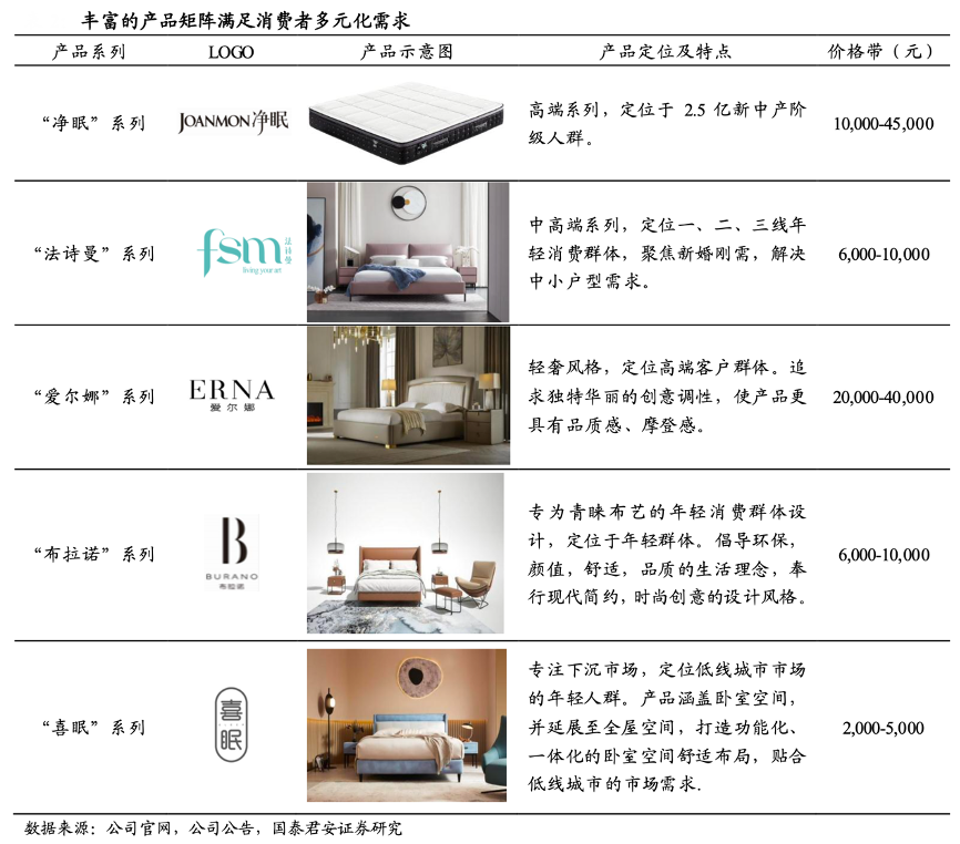 經典案例:根據公司官網、公司公告、國泰君安證券研究等綜合資訊表明,為了迎合消費者的多元化需求,喜臨門公司針對不同目標客戶設計了不同系列的產品,其中包括主打保護脊椎、定位于2.5億新中產階級人群的“凈眠”系列;解決中小戶型需求,定位中高端的“法詩曼”系列等。2019 年,公司新推出了“喜眠”系列產品,這是喜臨門從中高端市場下沉到低端市場的一個嘗試,產品系列得到了進一步擴充。