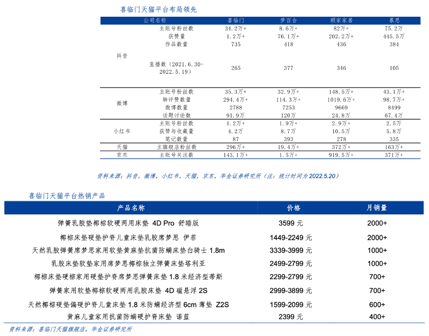 經典案例:根據抖音、微博、小紅書、天貓、京東、喜臨門天貓旗艦店、華金證券研究所等綜合資訊表明,喜臨門公司線上熱銷產品價格帶主要在 1000-4000 元區間,更符合年輕群體的消費能力;線下產品則主要以中產階級為主(新房裝修以及新婚人群),其產品價格帶主要在8000-10000元左右。