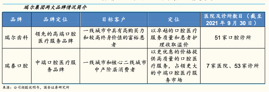 經典案例:根據公司招股說明書、國金證券研究所等綜合資訊表明,瑞爾集團成立于 1999 年,是中國最大的高端民營口腔醫療服務提供商,公司業務遍布全國,同時運營瑞爾齒科(領先的高端品牌)和瑞泰口腔 (快速成長的大眾品牌之一)。