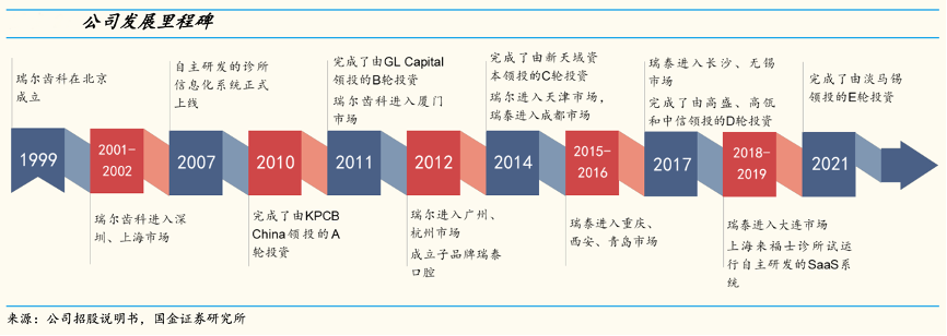 經典案例:根據公司招股說明書、國金證券研究所等綜合資訊表明,1999 年 4 月,瑞爾齒科創始人鄒其芳先生創建了北京第一家國內高端口腔診所,定位高端人群。2012年,公司推出第二品牌瑞泰口腔,服務于國內的中端人群,公司也從前 1999 年-2010 年的學習積累期,進入了 2012 年至今的快速發展期。