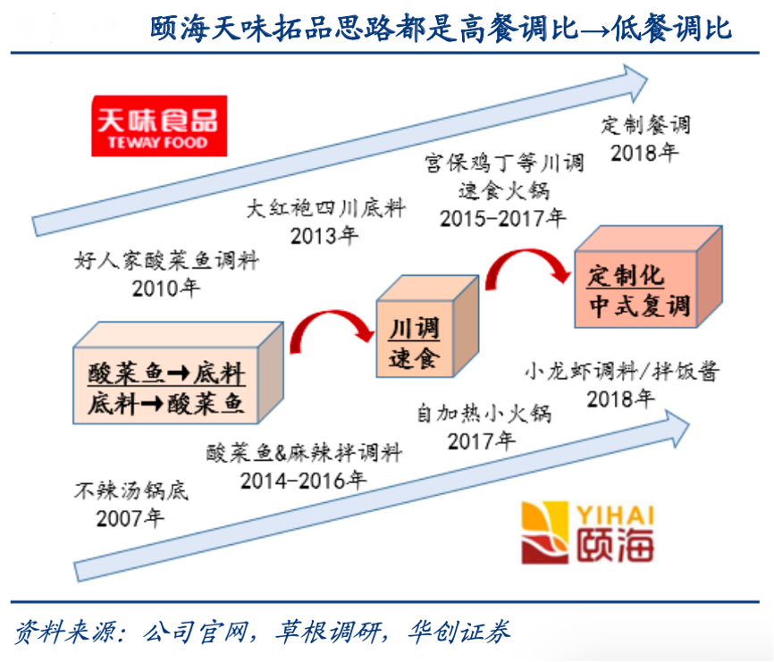 經典案例:根據公司官網、草根調研、華創證券等綜合資訊表明,天味圍繞川調做多元化,并通過參股上游原料商、投資下游定制餐調企業打造產業生態圈,頤海則依托底料開發方便速食及中式復調。