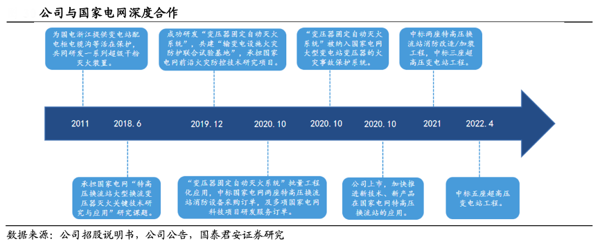 經(jīng)典案例:根據(jù)公司招股說明書、公司公告、國(guó)泰君安證券研究等綜合資訊表明,國(guó)安達(dá)工業(yè)消防客戶認(rèn)證壁壘高,其與國(guó)家電網(wǎng)深度合作。其變壓器固定自動(dòng)滅火系統(tǒng)中標(biāo)國(guó)家電網(wǎng)公司兩項(xiàng)特高壓換流站的消防設(shè)備采購訂單(中標(biāo)金額共計(jì) 3,881.96 萬元)及多項(xiàng)國(guó)家電網(wǎng)科技項(xiàng)目研發(fā)服務(wù)訂單,表明公司的專業(yè)程度和產(chǎn)品質(zhì)量均受到行業(yè)內(nèi)核心客戶的認(rèn)證。