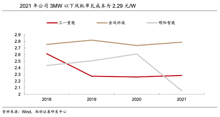 經(jīng)典案例:根據(jù)wind、西部證券研發(fā)中心等綜合資訊表明,2019-2021年,三一重能 3MW 以下風(fēng)機(jī)單瓦成本分別為 2.27/2.26/2.29 元/W,低于行業(yè)平均 0.39/0.41/0.14 元/W,體現(xiàn)了公司雙饋技術(shù)路線、葉片自制、風(fēng)機(jī)輕量化設(shè)計(jì)帶來的成本優(yōu)勢。