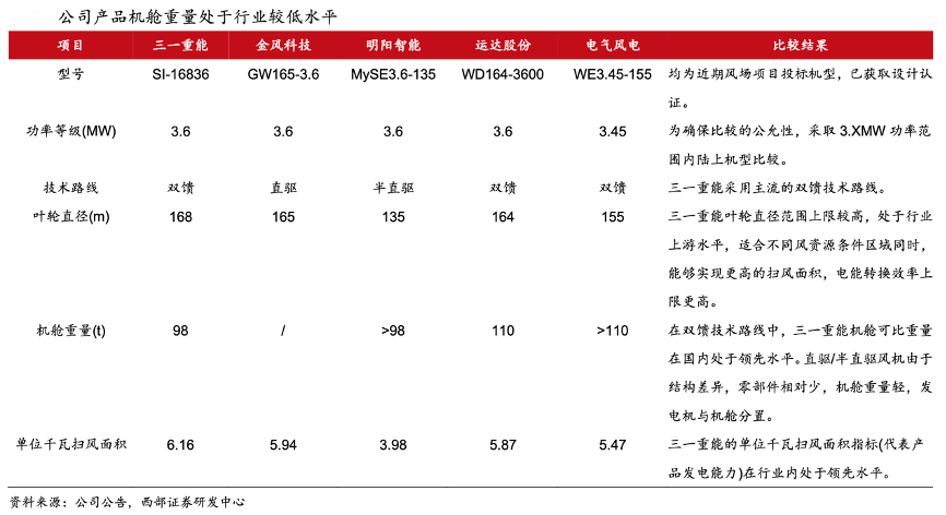 經(jīng)典案例:根據(jù)公司公告、西部證券研發(fā)中心等綜合資訊表明,三一重能公司在風(fēng)電機(jī)組結(jié)構(gòu)件輕量化設(shè)計(jì)方面具備顯著優(yōu)勢。與同行業(yè) 3.XMW 功率機(jī)型對(duì)比,公司產(chǎn)品機(jī)艙重量處于同行業(yè)中較低水平,同時(shí)公司產(chǎn)品葉輪直徑、單位千瓦掃風(fēng)面積行業(yè)領(lǐng)先。