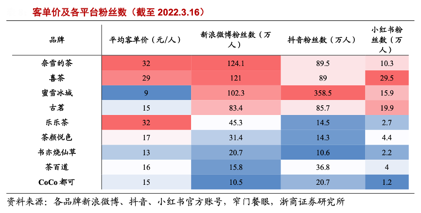 經典案例:根據各品牌新浪微博、抖音、小紅書官方帳號、窄門餐眼、浙商證券研究所等綜合資訊表明,各品牌在主流社交媒體粉絲數量統計,截至 3 月 16 日,奈雪的茶、喜茶分別在微博、小紅書平臺擁有最高的粉絲數量,心智占領程度較高。
