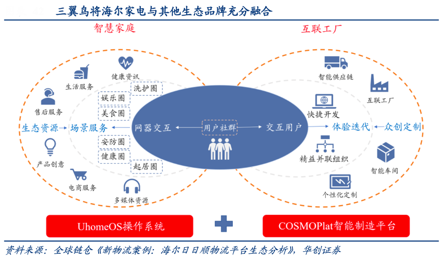 經(jīng)典案例:根據(jù)全球鏈倉《新物流案例:海爾日日順物流平臺生態(tài)分析》、華創(chuàng)證券等綜合資訊表明,三翼鳥生態(tài)以海爾家電為基礎(chǔ)不斷延伸拓展,借助卡奧斯平臺賦能提高生產(chǎn)供應(yīng)商效率,UhomeOS系統(tǒng)為智慧家庭提供操作接口,高端品牌卡薩帝提供套系產(chǎn)品,最終通過日日順物流的高效送裝實(shí)現(xiàn)場景生態(tài)落地。
