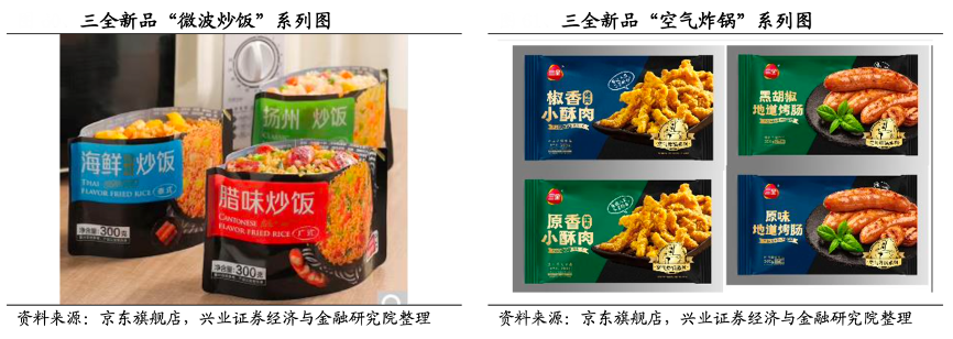 經(jīng)典案例:根據(jù)京東旗艦店、興業(yè)證券經(jīng)濟與金融研究院等綜合資訊表明,三全公司于2022年 3 月推出“微波炒飯”系列,通過重新梳理炒飯的場景及定位,發(fā)現(xiàn)競品賣得不好主因價值鏈定位不精準,因此公司依靠生產(chǎn)效率,將成本做到了 7 元+/ 份。同時公司推出家庭用的“空氣炸鍋”系列,計劃通過焦炸丸子過渡,瞄準預(yù)制菜中的有預(yù)制食材領(lǐng)域,“產(chǎn)品邏輯”有望持續(xù)驅(qū)動收入增長。