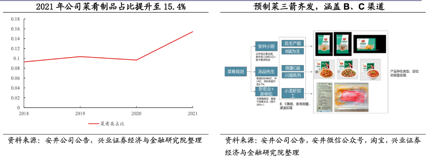 經(jīng)典案例:根據(jù)安井公司公告、安井微信公眾號、淘寶、興業(yè)證券經(jīng)濟與金融研究院等綜合資訊表明,截止2021年,安井公司菜肴制品占比為 15.4%,同時公司將預(yù)制菜上升至較高的戰(zhàn)略地位,升級凍品先生“快手菜”系列,給予冰柜陳列支持導(dǎo)入市場,進行資源聚焦。其于2022年推出安井小廚,針對 B 端發(fā)力,自產(chǎn)為主,配合安井的渠道、經(jīng)銷商服務(wù)管理、品類推新能力均為上乘。