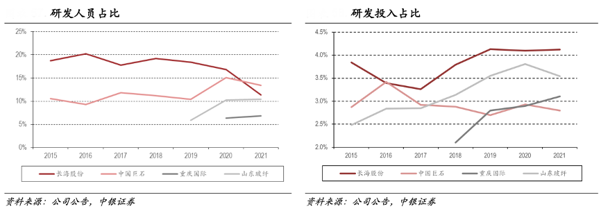 經(jīng)典案例:根據(jù)公司公告、中銀證券等綜合資訊表明,長海股份公司重研發(fā),研發(fā)人員占比及投入占比均處于行業(yè)上游水平:截至2021年末,公司共有研發(fā)人員 263 人,研發(fā)人員占比 11.4%,僅次于中國巨石;2021年公司研發(fā)投入 1.03 億元,同比增長 23.4%,研發(fā)投入占比 4.1%,持續(xù)領(lǐng)先同業(yè)公司。公司技術(shù)開發(fā)以自主研發(fā)為主,并與常州大學(xué)等高校開展 合作。截至 2021 年末,公司擁有發(fā)明專利 36 項(xiàng)。