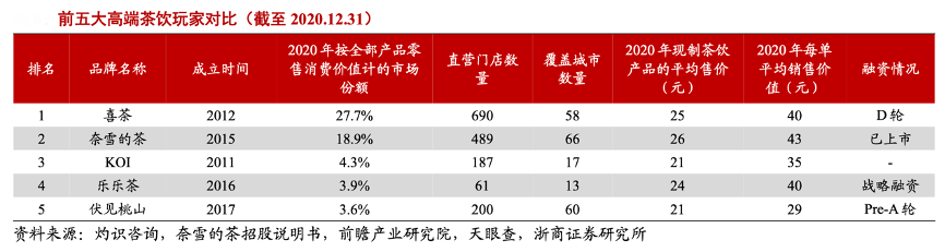 經典案例:根據灼識咨詢、奈雪的茶招股說明書、前瞻產業研究院、天眼查、浙商證券研究所等綜合資訊表明,從增速來看,根據艾瑞咨詢,高端現制茶飲店零售規模在 2015-2020 年復合增速為 75.8%,2020- 2025年預期復合增速為 32.2%,顯著高于中端和低端茶飲預期復合增速。從零售額占比來看,2020年中國高端現制茶飲零售額占中國整體現制茶飲的19.7%,而 2025 年,預計高端茶飲占比為 24.6%,高端現制茶飲份額有望持續提升。
