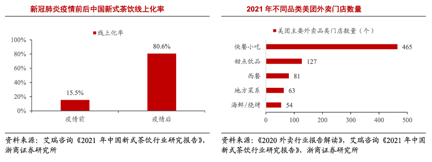 經典案例:根據艾瑞咨詢《2021年中國新式茶飲行業研究報告》、《2020外賣行業報告解讀》、浙商證券研究所等綜合資訊表明,截至 2020 年,現制茶飲的外賣零售額占比約為 25.0%,且預期 2025 年現制茶飲的外賣 占比上升至 33.2%。同時根據《2021 年 美團業務經營狀況與中國外賣行業研究報告》,疫情前/后中國現制茶飲線上化率分別為15.5%/80.6%。根據奈雪發布《2021 年大數據報告》,2021年奈雪線上點單占比超 7 成,線上訂單數相比 2020 年增加 64%。