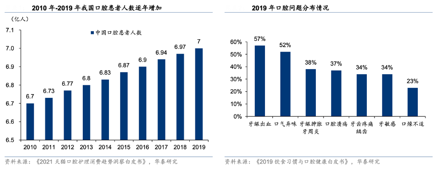 經典案例:根據天貓發布的《2021 天貓口腔護理消費洞察趨勢白皮書》、《2019飲食習慣與口腔健康白皮書》、華泰研究等綜合資訊表明,口腔護理主要達到清除牙菌斑、 保護牙齒及牙周健康的目的。,自 2010 年來,我國口腔患者人數逐年增加并已在 2019 年達到 7 億人,占全國總人數的一半,我國國民的口腔健康問題不容忽視。根據阿里健康與 CBN Data 聯合發布的《2019 飲 食習慣與口腔健康白皮書》,從口腔問題的分布情況來看,牙齦出血和口氣異味是排在前兩 位的癥狀。