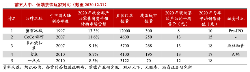 經典案例:根據灼識咨詢、奈雪的茶招股說明書、前瞻產業研究院、觀研天下、天眼查、浙商證券研究所等綜合資訊表明,低端茶飲市場集中度偏低,且不斷有新品牌涌現,尚未跑出絕對龍頭,高端品牌正 嘗試通過價格帶下沉搶占市場。高端茶飲龍頭奈雪的茶、喜茶從 2022 年初開始輪番 降價,2 月 24 日,喜茶官方公眾號發文稱2022 年將不再推出單價在 29 元及以上的飲品。
