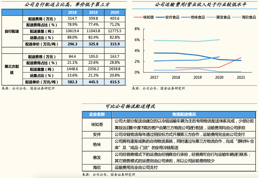 經典案例:根據公司公告、國金證券研究所等綜合資訊表明,味知香公司自建較為完善的冷鏈物流配送體系,目前 80%以上的產品為自行運輸配送,可保障配送途中產品質量與運輸效率。同時公司對華東以外客戶的配送采用與第三方物流合作的方式。目前在上海、浙江、江蘇范圍配送可以做到 2 次/周,合肥地區配送為 1 次/周。
