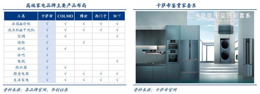 經典案例:根據各品牌官網、卡薩帝官網、華創證券等綜合資訊表明,相較于其他高端品牌,卡薩帝不僅覆蓋了冰洗空等傳統家電產品,還擁有熱水器、廚電、酒柜等其他品類,是當前國內覆蓋品類最全面的高端品牌。在此基礎上進一步推出鑒賞家、指揮家等套系化產品系列,深挖用戶場景需求,成為國內家電市場高端套系產品的首創者。