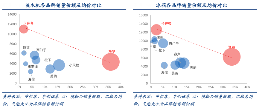經典案例:根據中怡康、華創證券等綜合資訊表明,卡薩帝與海爾主品牌已構筑出獨占盈利與規模優勢的共贏體系。以核心品類冰箱、洗衣機為例,由海爾-卡薩帝建立的品牌組合體系構成天花板,沒有任何品牌可以在同等價格下售出更高銷量,或者在售出同級別銷量的前提下達到更高均價。