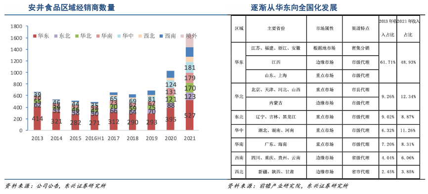 經典案例:根據公司公告、前瞻產業研究院、東興證券研究所等綜合資訊表明,安井安井一直采取對經銷商取貼身服務的模式,推動經銷商從坐商-行商-平臺商-終端商發展,培養了一批實力雄厚的經銷商。目前安井品牌在大流通和 C 端的大單品品類中,已經具有明顯的品牌號召力。